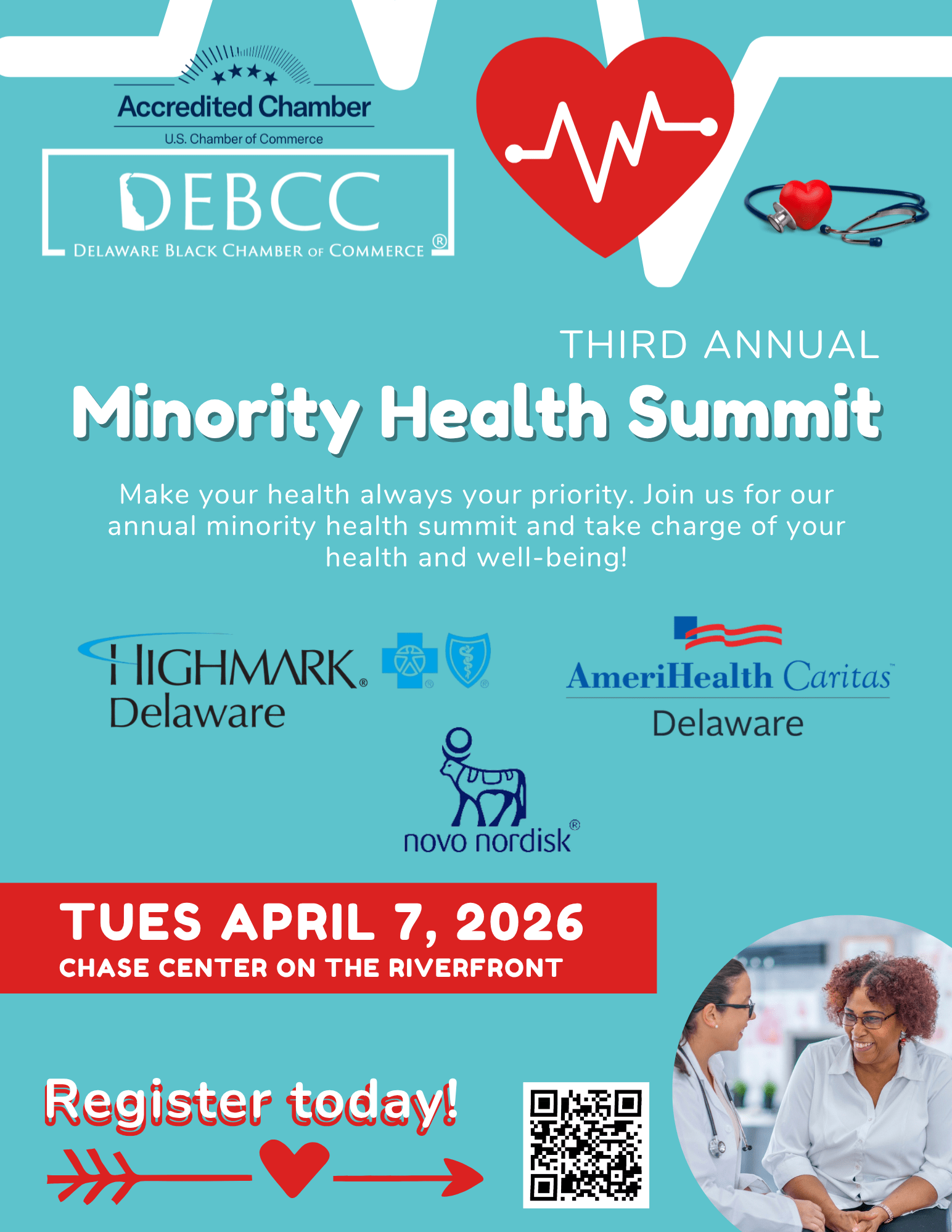 As April is National Minority Wellness Month, the DEBCC is hosting its 3rd Annual Minority Health Summit, open to all minority businesses and communities throughout Delaware. This event features presentations from local and national leaders on current health issues in the Delaware population and resources to address them to improve health and well-being for individuals, their families, and businesses. The day will include educational presentations, discussions, and health screenings from leading providers in Delaware. The event will also include healthy food and prizes.